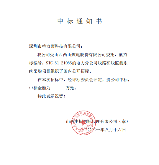 我公可受山西西山煤電股份有限公司委托,就招標(biāo)編號(hào):STC-S1-21086的電力分公司線路在線監(jiān)測(cè)系統(tǒng)采購(gòu)項(xiàng)目組織了國(guó)內(nèi)公開招標(biāo)。在本次招標(biāo)中,經(jīng)評(píng)標(biāo)委員會(huì)評(píng)定,我司公司中標(biāo),中標(biāo)公告如下:
