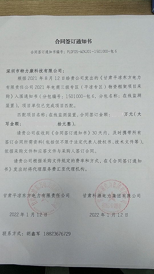 根據(jù)2021年8月12日給貴公司發(fā)出的《甘肅平?jīng)鰱|方電力有限責任公司2021年電商三級專區(qū)(平?jīng)鰧^(qū))物資框架項目采購》入圍通知書(分包編號: 1501000-包6, 分包名稱:在線監(jiān)測裝置,項目單位已完成項目匹配。成交通知如下: