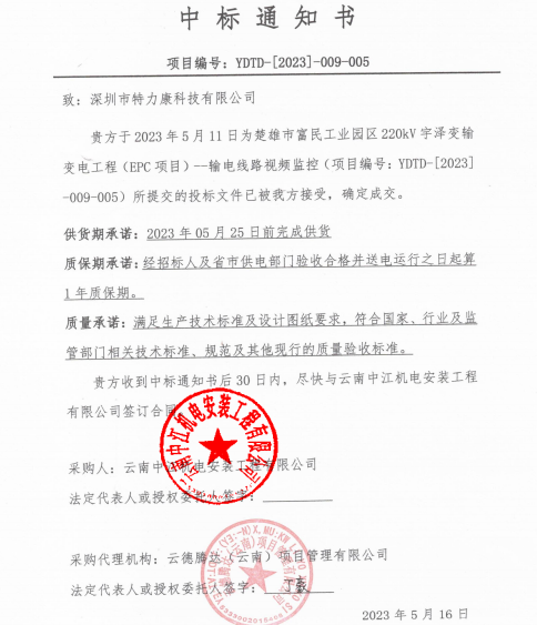 我司于2023年5月11日為楚雄市富民工業(yè)園區(qū)220kV宇澤變輸變電工程(EPC項目)-輸電線路視頻監(jiān)控(項目編號: YDTD-[2023]-009-005) 所提交的投標文件已被我方接受,確定成交。